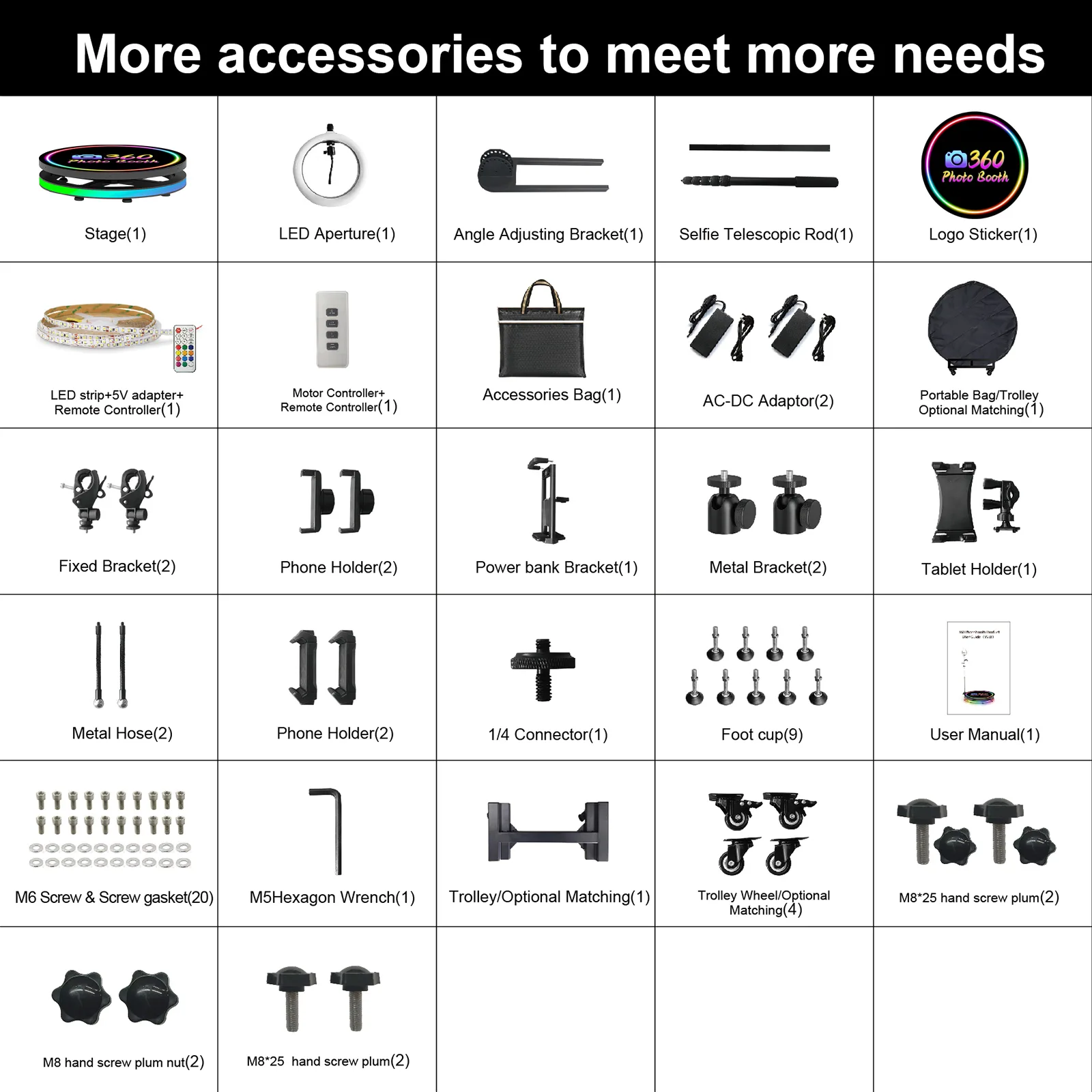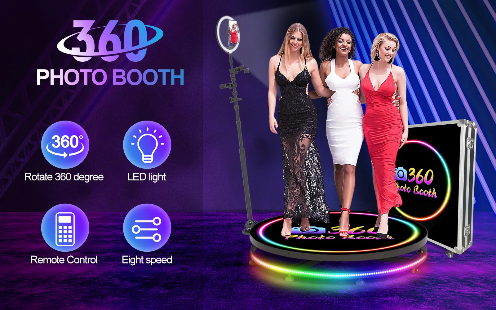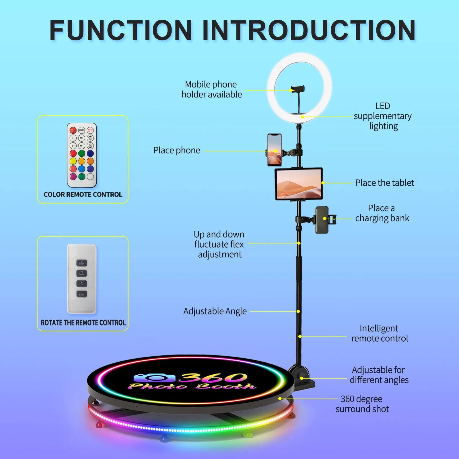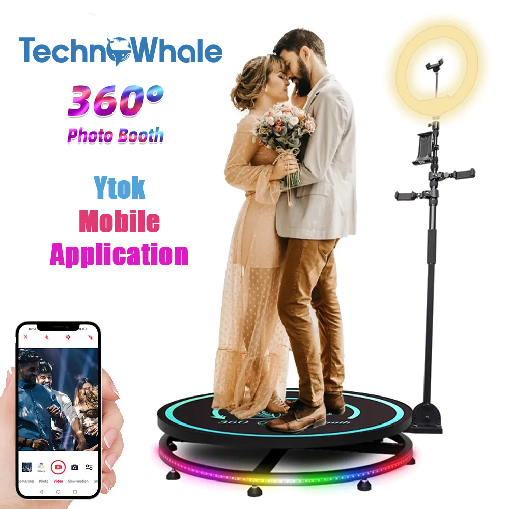 Two ways to control the machine,through the Button/APP (Ytok), you can wirelessly control the speed of the 360 camera booth machine rotation, spin clockwise or counterclockwise.APP can also set the control time.The length and angle of the selfie stick can be adjusted as your needed. The selfie 360 rotating photo booth are also equipped with multicolor led strip light , sticker and other props to increase the sense of atmosphere.